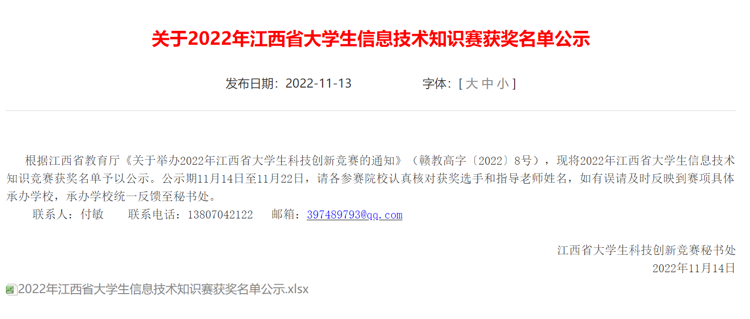 近日,2022年江西省大学生科技创新竞赛信息技术知识竞赛获奖名单在江西省教育厅官网完成公示,我校学子荣获江西省本科专业组一等奖1项、二等奖4项、三等奖13项;本科非专业组一等奖1项、二等奖4项、三等奖5项,共计28个奖项的好成绩。