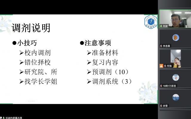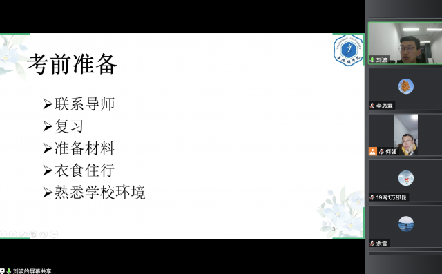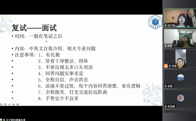 会议伊始,毕业班辅导员何强老师介绍了此次交流会的目的,希望同学们通过此次交流会能切实提高考研复试的能力,取得理想的成绩。会上,青年教师刘波、汪子婷等先后从面试前期准备、专业调剂政策、面试流程等方面分享了各自的经验,并就如何联系导师、怎样准备材料、调整心理状态、面试注意事项、调剂的操作流程等进行较为详细介绍。