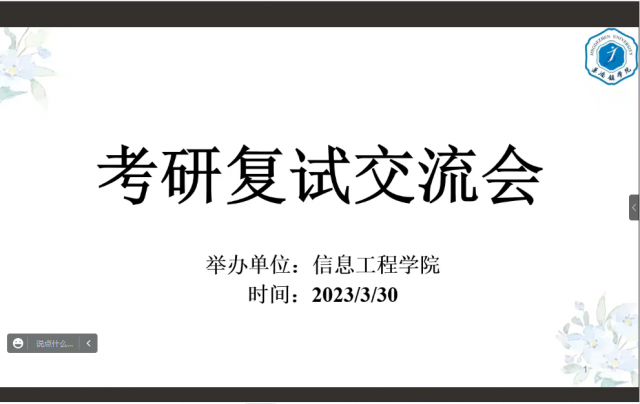 为帮助我院考研学子了解考研复试相关程序、面试技巧及专业调剂相关政策等,2023年3月30日晚上,我院考研辅导团队对即将参加研究生复试的学子们进行了线上的复试指导和交流会。